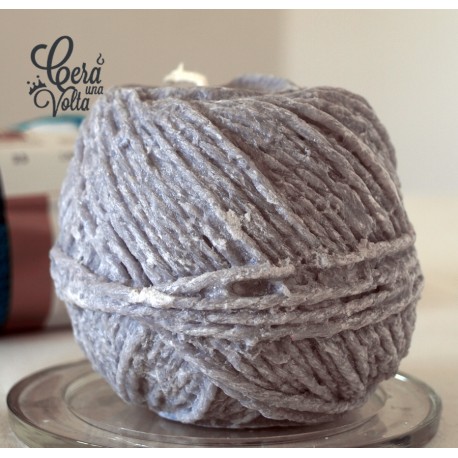 Candela in paraffina che riprende in tutto e per tutto la forma e i particolari di un gomitolo di lana…